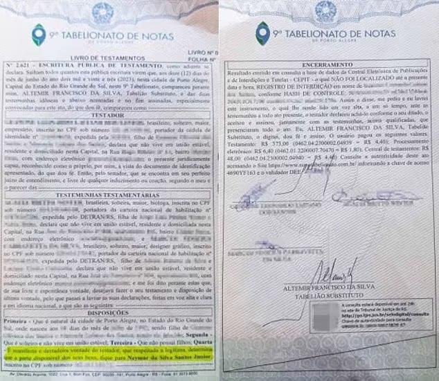 据报道,该遗嘱已于6月12日在巴西阿雷格里港的一家公证处正式订立,并有两名见证人在场。目前,该遗嘱仍需得到巴西法院的批准,内马尔才能被正式确认为继承人。